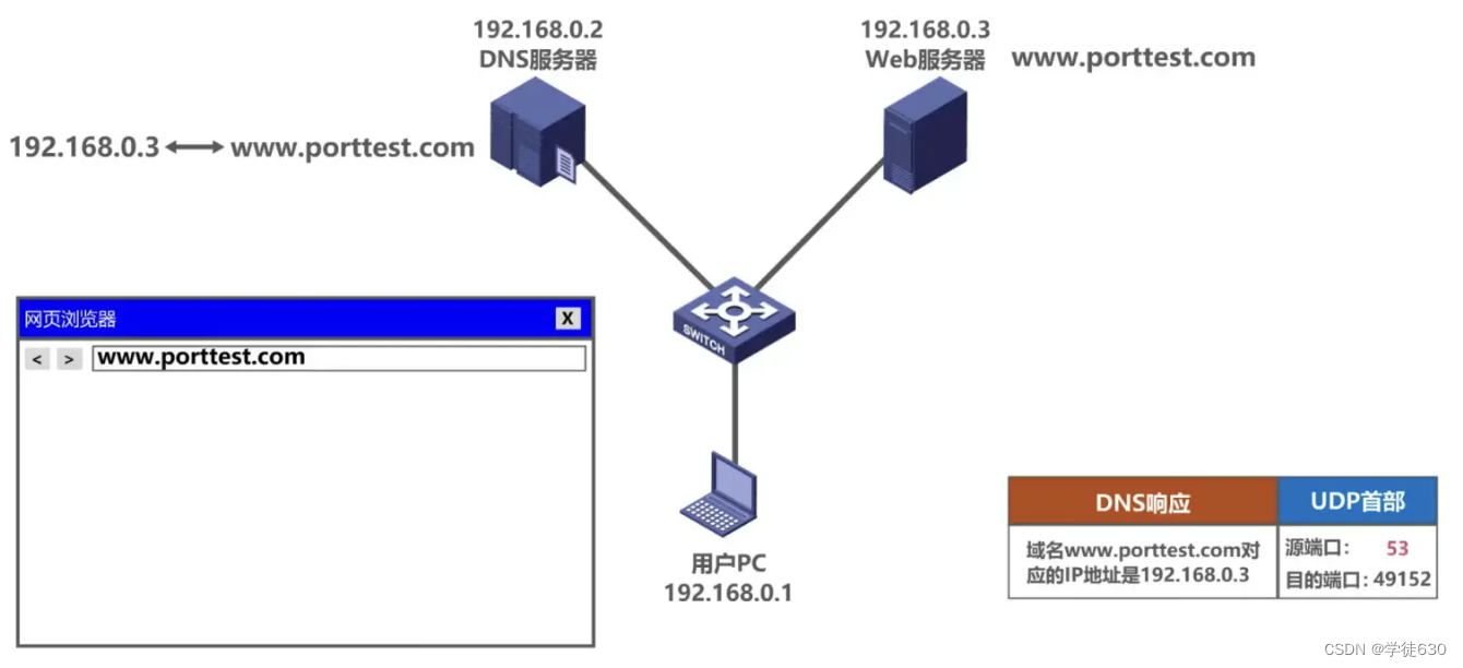之后,会给用户PC发送DNS响应报文,DNS响应报文需要使用运输层的UDP协议封装成UDP用户数据报