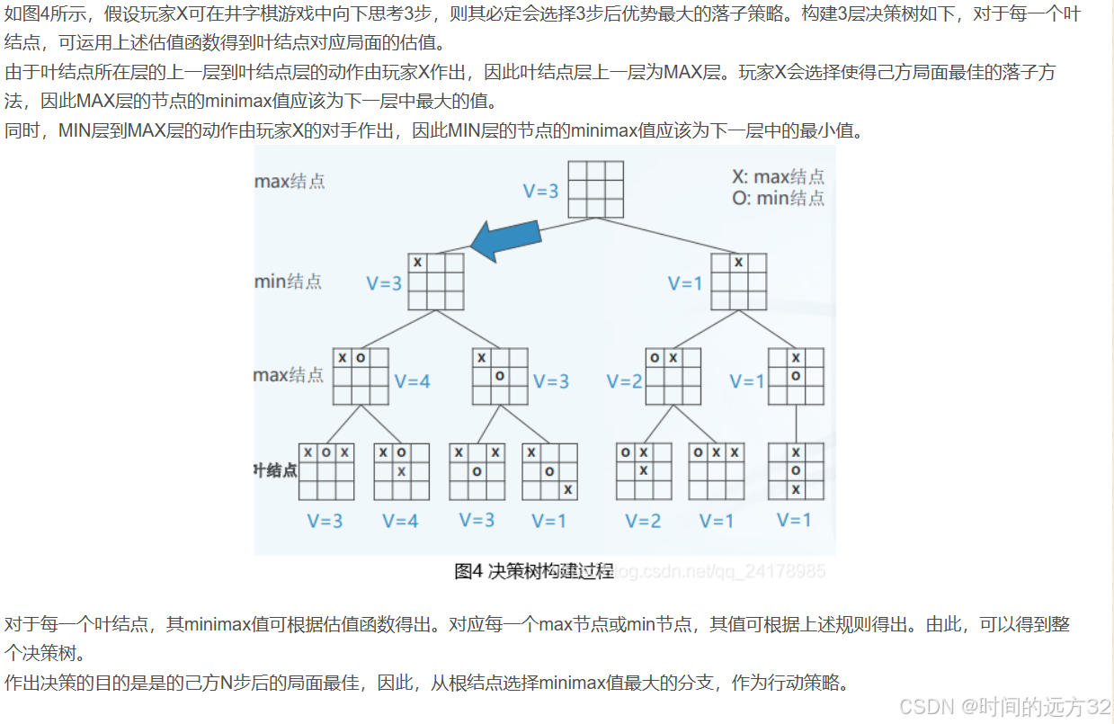 以下图中为决策树的构建过程,即以上代码的思路过程,下图中假设向下思考三步,相当于将上文代码中depth设置为三即向下搜索三步即停止,而上文中代码会将棋盘所有情况都遍历一遍,评估所有可能的走法及其对未来状态的影响。该函数计算棋盘上 'X' 和 'O' 的数量,并返回当前应走子的符号('X' 或 'O')。因此,最大化玩家会尝试找到能产生最高策略得分的走法(即让自己获胜或打平),而最小化玩家会尝试找到能产生最低策略得分的走法(即让最大化玩家输掉或打平)。希望最大化玩家输掉或打平(策略得分为 0)的可能性。