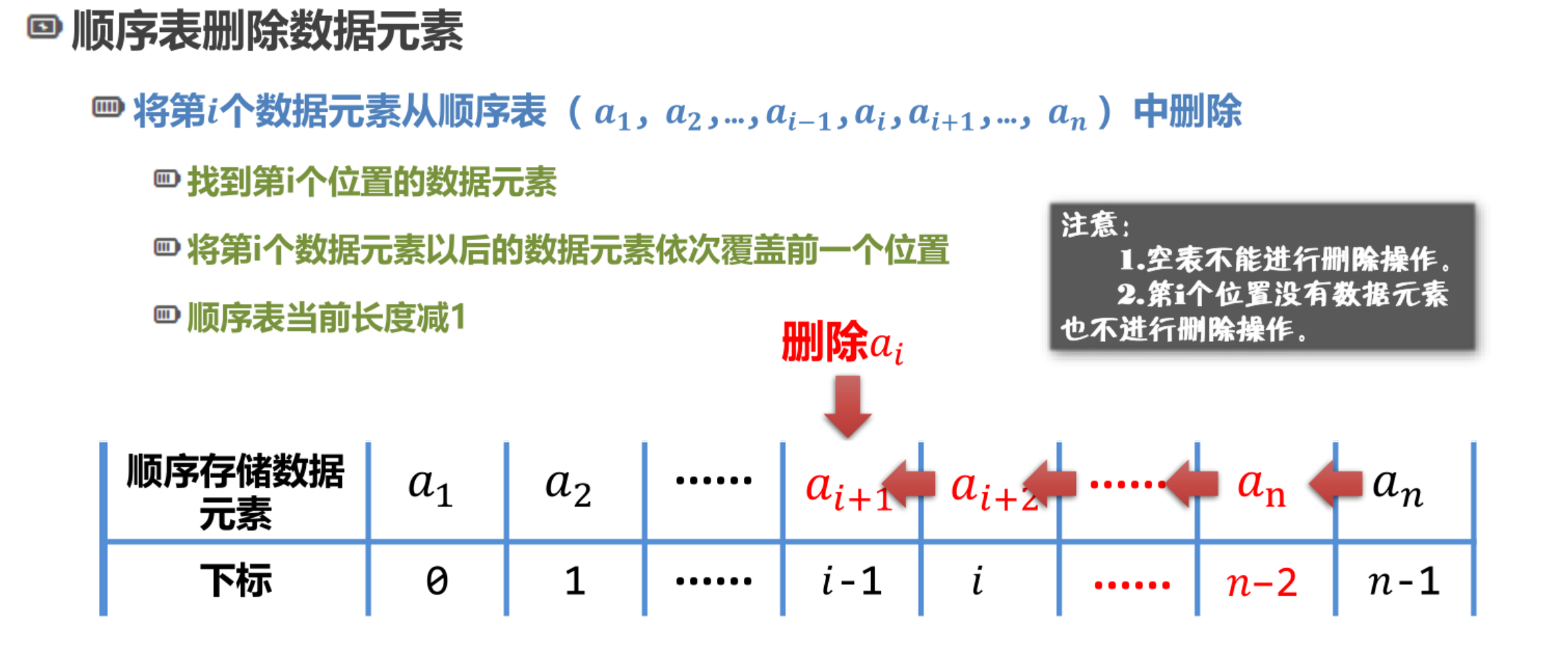 将第𝒊个数据元素从顺序表( 𝒂1 , 𝒂2 ,…,𝒂 𝒊−1 ,𝒂 𝒊 ,𝒂 𝒊+1 ,…, 𝒂n )中删除