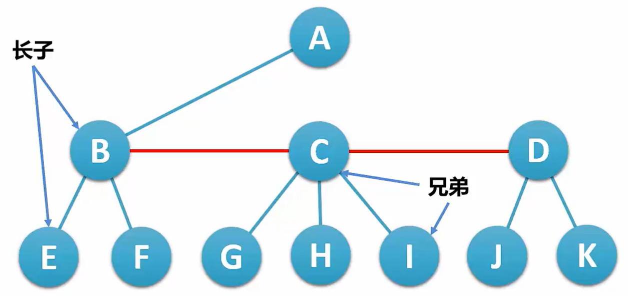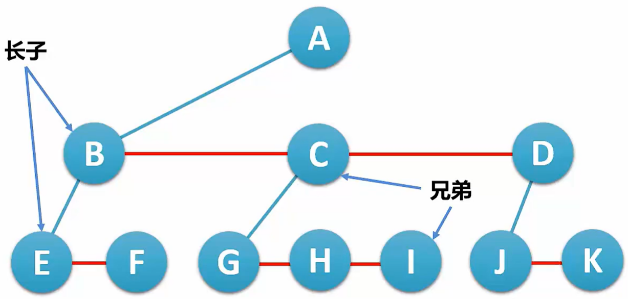 孩子兄弟表示法构建一棵树,按照长子在左侧、兄弟在右侧的顺序转化为二叉树