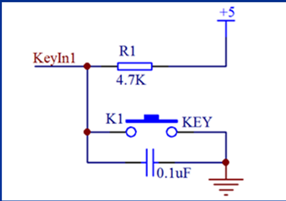 如下图所示:当k1按下以后,由于接地,IO接口和内部输入口就会变成低电平,当按键不按下且内部没有输出时,IO口默认为高电平