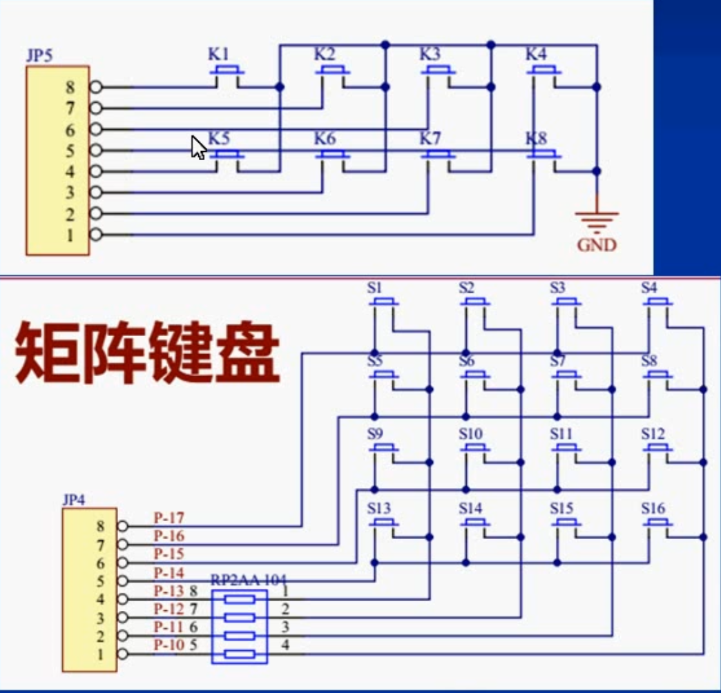 由图可得:同样是8个IO接口,独立按键只能连接8个按钮,而矩阵键盘可以连接16个接口,所以矩阵键盘经常用于按键比较多的情况