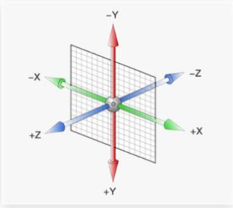 空间:是从坐标轴角度定义的 X 、Y 和 Z 三条坐标轴构成了一个立体空间,Z 轴位置与视线方向相同。