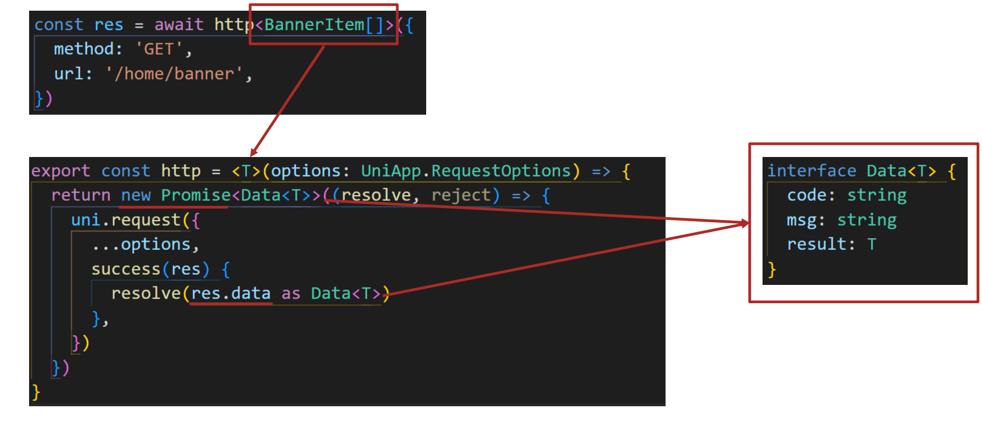 ⚫ uni.request 的 success 回调函数只是表示服务器 响应成功 , 没处理响应状态码 ,业务中使用不方便⚫ axios 函数是只有 响应状态码是 2xx 才调用 resolve 函数,表示获取数据成功 ,业务中使用更准确