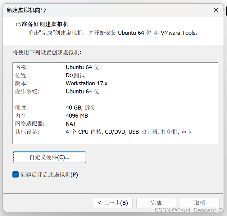 自定义硬件配置完成,选择创建后开启此虚拟机,点击完成开始创建,静待创建完成即可