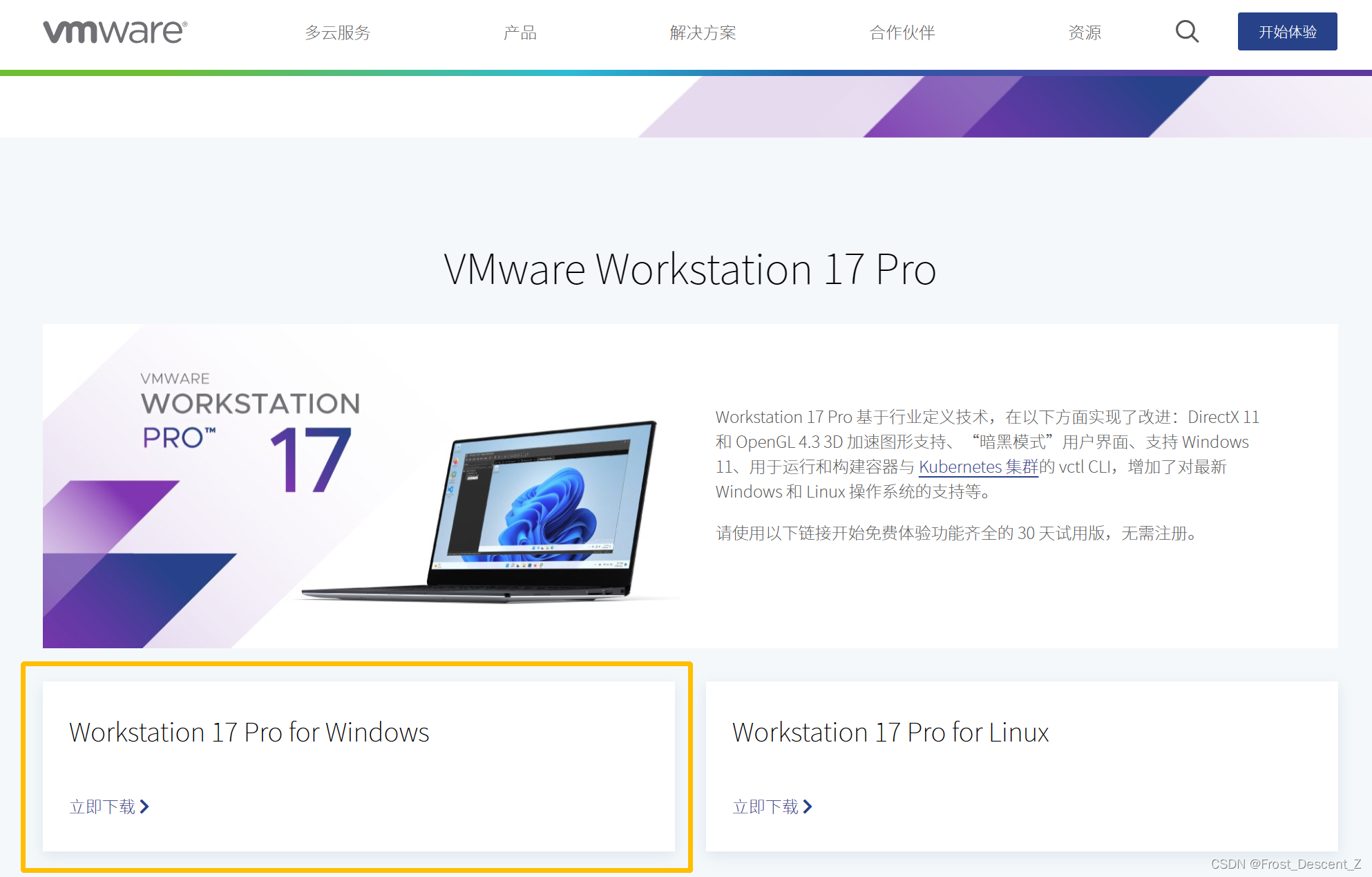 https://www.vmware.com/cn/products/workstation-pro/workstation-pro-evaluation.html找到Workstation 17 Pro for Windows,点击立即下载