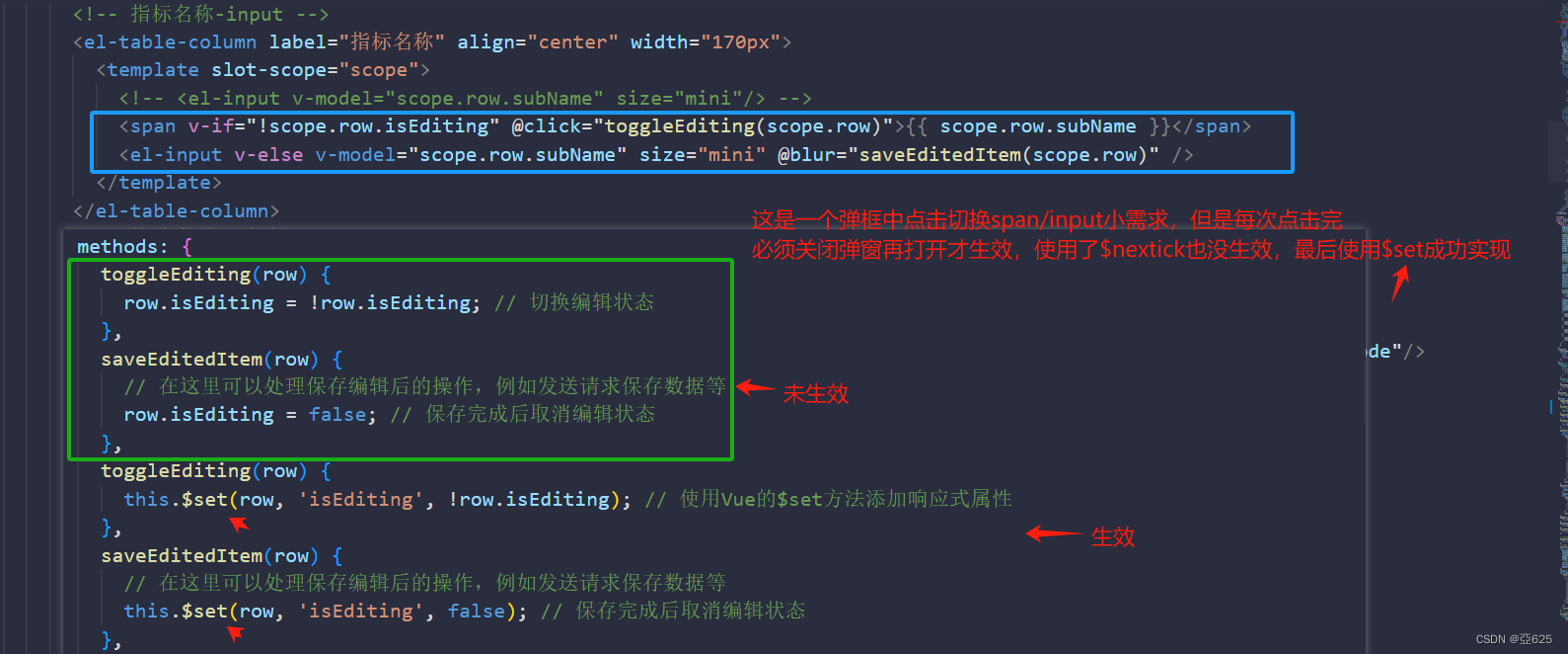 弹窗中切换span、input不生效问题 需求:在弹窗中实现通过点击,任意切换span、input,但是每次都是关闭弹窗后再打开才发现生效了。想是Dom的延迟问题,使用。后发现还是不好使,为了这块逻辑不复杂化,最后通过。
