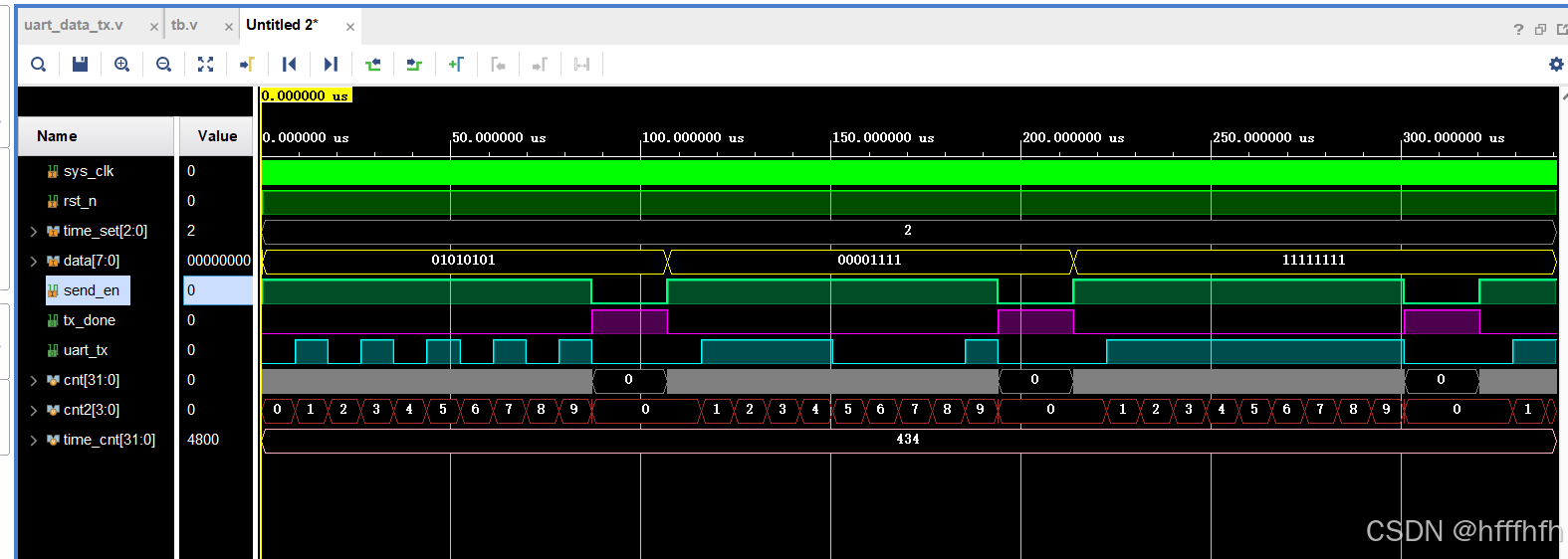 串口发送8bit数据 首先,晶振带动时钟,时钟开始以20ns的节奏循环往复地跳动;在时钟的指挥下,rst_n复位信号也开始在一定的时间后拉高。一旦rst_n拉高,cnt、cnt2、send_en、tx_done就要开始分别执行各自的工作了。cnt初始值为0;cnt2初始值也为0,cnt2为零对应的程序是要发送start信号。