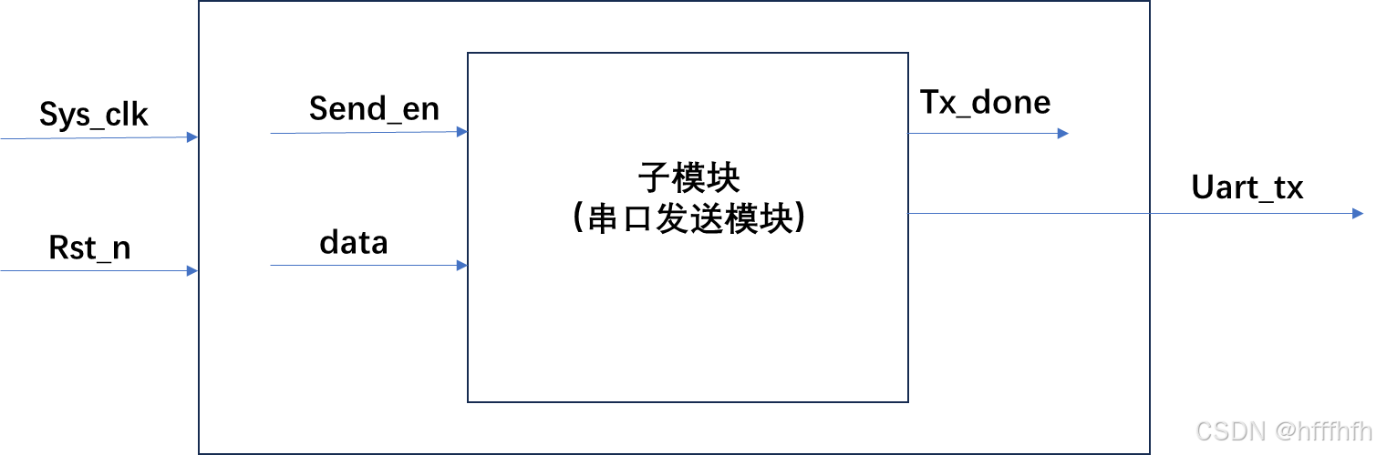串口发送数据 大模块涵盖下面的端口 ↓子模块涵盖下面的端口 ↓input [2:0] time_set , //基础计数器的设置这是之前串口发送8bit的模块,这个模块在这次的项目中称作子模块。子模块中有两个输出,5个输入。在之前的项目中,子模块的三个输入↓是在tb文件里面写成了激励信号所以现在的大模块,把要send_en、data写好。又因为需要一个10ms计时器,所以需要再写一个cnt_10ms。总共三个模块要在大模块里写完:send_en、data、cnt_10ms。