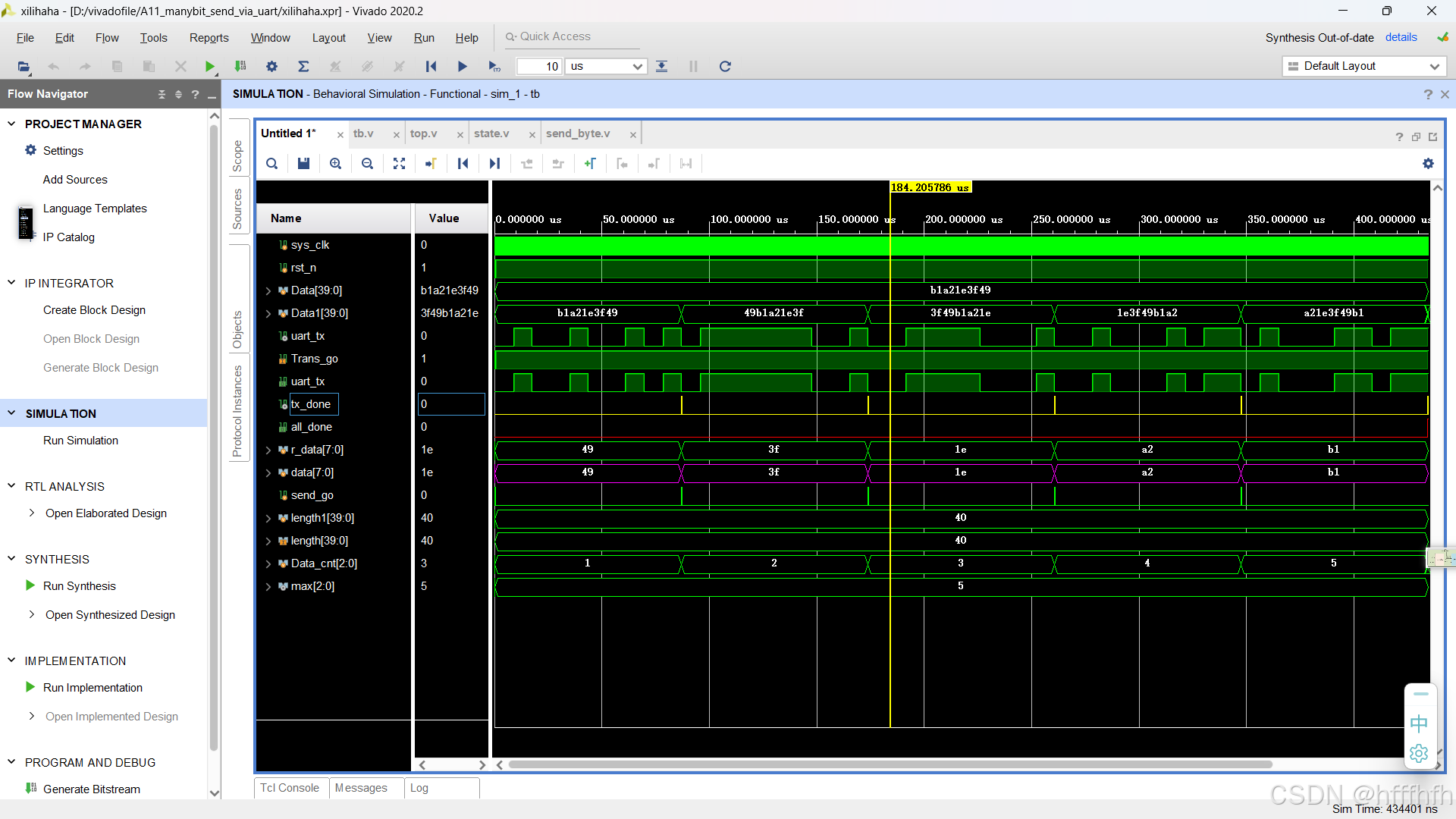 串口发送多bit优化:在测试文件里修改传输长度和传输的数据 send_byte|是单字节串口发送state|控制多bit整体右移8bit来更新传给send_byte串口模块的值top|给state模块发送想传输字节的Data数值和长度length