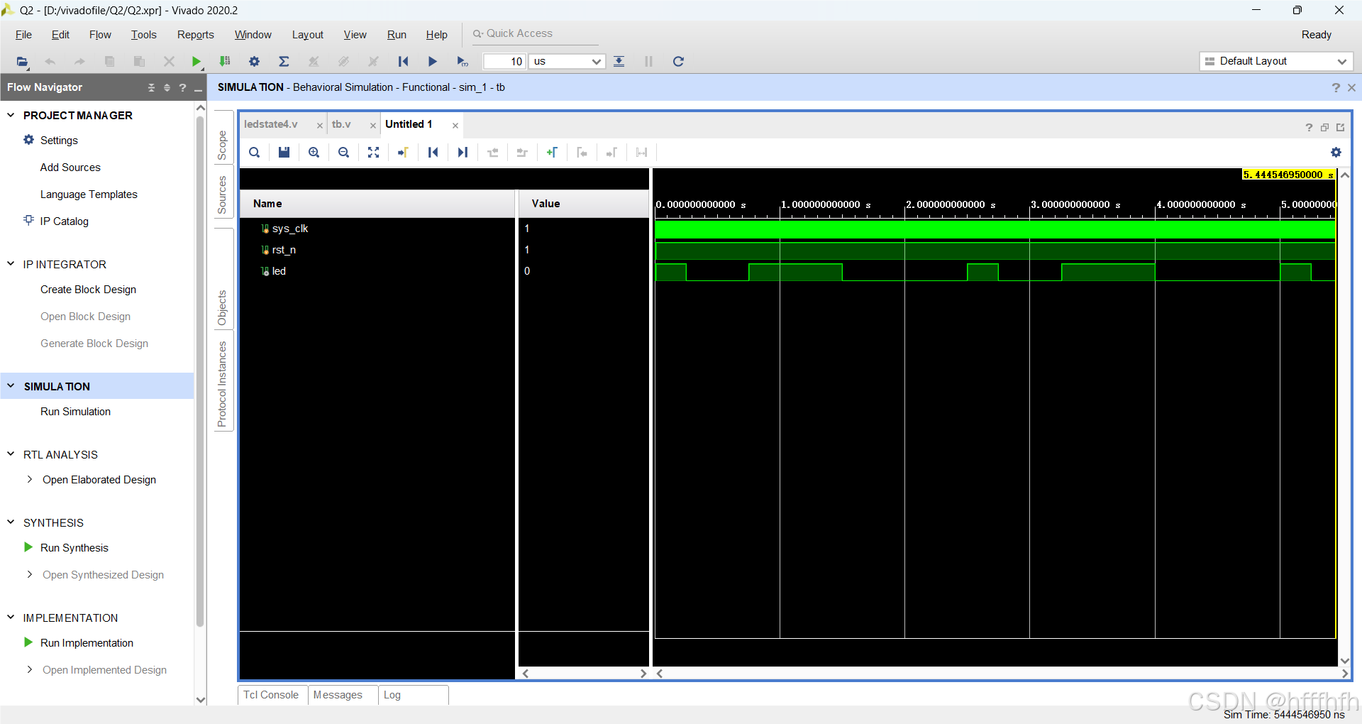 4个灯按照不同频率发光 所以我把output的led,设置为了wire。原本我想的是设置成reg,后来vivado提示。最后我想到了,我把reg类型的led[0],填在了例化过来的led端。这是不对的,应该把顶层的端口和底层的用wire连起来。做的实验是小梅哥的一个实验:使4个LED灯以不同的频率去闪烁。在顶层模块只能连线。也就是不要有赋值的变量,不要在顶层赋值。顶层我实例化了4个相同的模块:一个LED亮的模块。