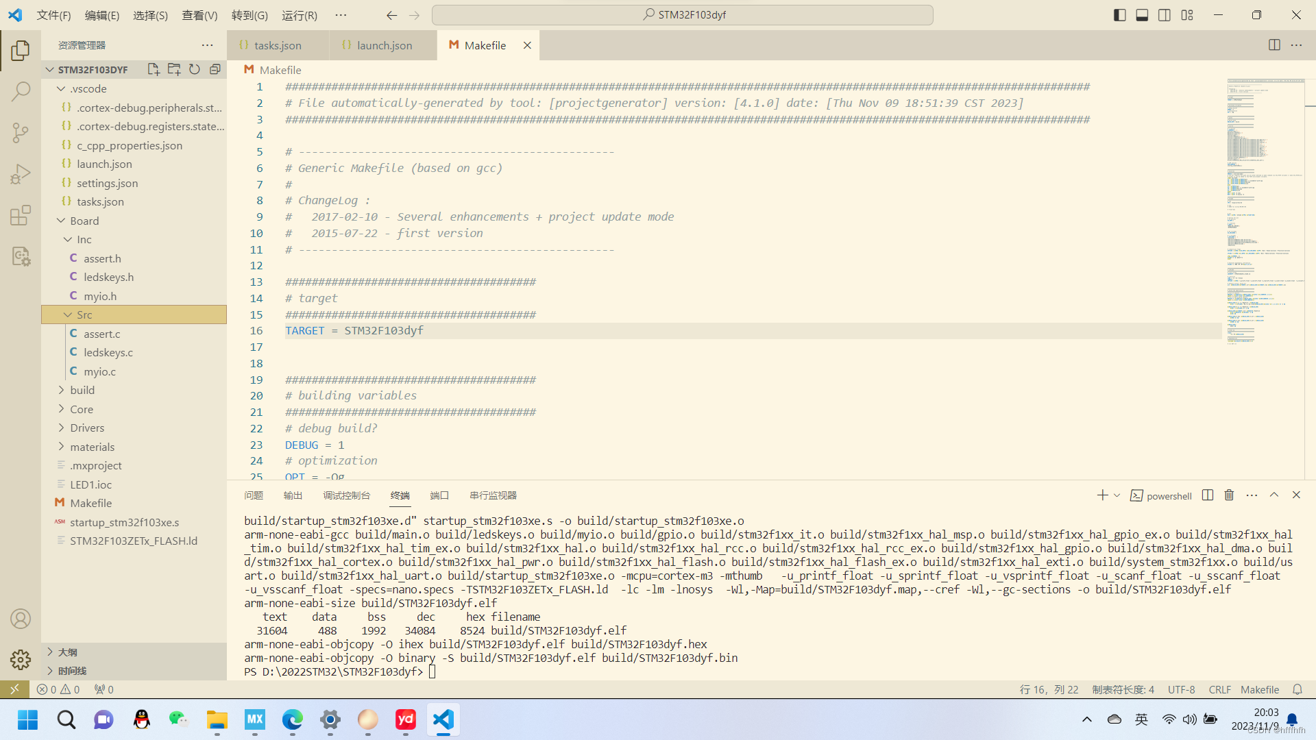 “program build/STM32F103.elf verify reset exit“ 2:“program build/STM32F103.elf verify reset exit"这是一个命令,跟着task文件来的。是task.json文件里的。写错了elf文件名字的原因。
