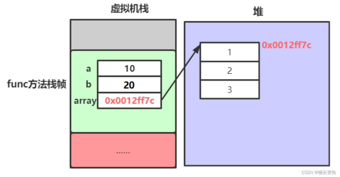 程序计数器 (PC Register): 只是一个很小的空间 , 保存下一条执行的指令的地址虚拟机栈(JVM Stack): 与方法调用相关的一些信息, 每个方法在执行时,都会先创建一个栈帧 ,栈帧中包含 有:局部变量表 、 操作数栈 、 动态链接 、 返回地址 以及其他的一些信息,保存的都是与方法执行时相关的一 些信息。比如:局部变量 当方法运行结束后,栈帧就被销毁了,即栈帧中保存的数据也被销毁了 。本地方法栈(Native Method Stack): 本地方法栈与虚拟机栈的作用类似 . 只不过 保存的内容是 Native 方法的局 部变量 . 在有些版本的 JVM 实现中 ( 例如 HotSpot), 本地方法栈和虚拟机栈是一起的堆(Heap): JVM 所管理的最大内存区域 . 使用 new 创建的对象都是在堆上保存 ( 例如前面的 new int[]{1, 2, 3} ) , 堆是随着程序开始运行时而创建,随着程序的退出而销毁,堆中的数据只要还有在使用,就不会被销 毁 。方法区(Method Area): 用于 存储已被虚拟机加载的类信息、常量、静态变量、即时编译器编译后的代码等数 据 . 方法编译出的的字节码就是保存在这个区域