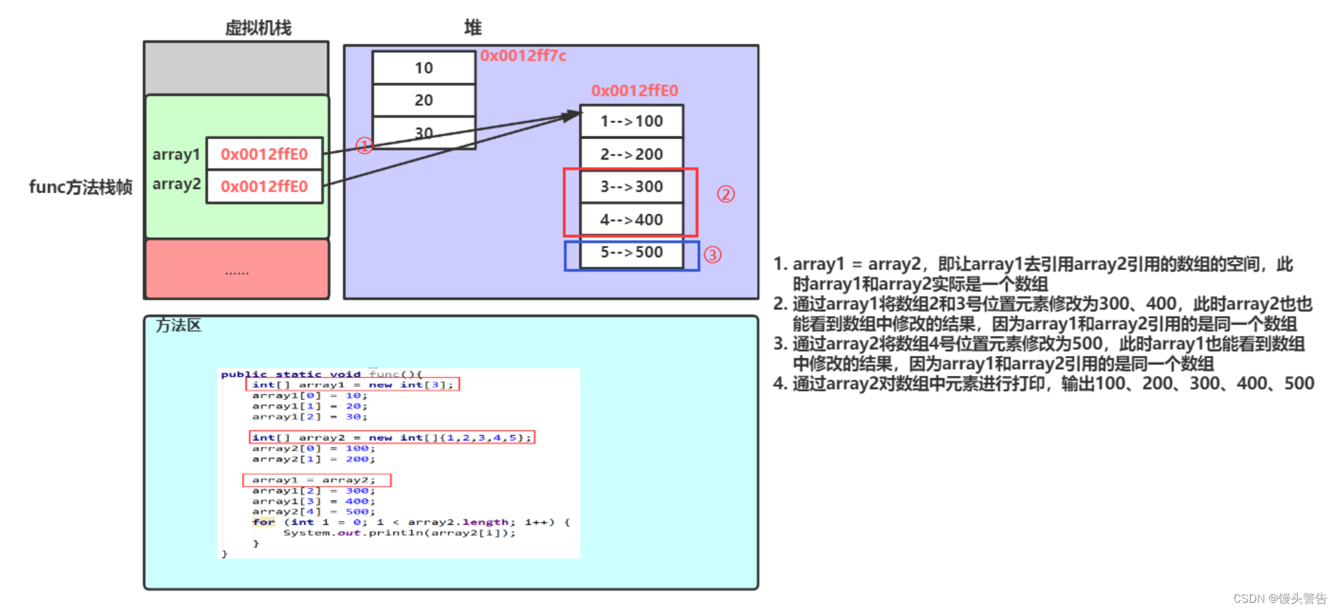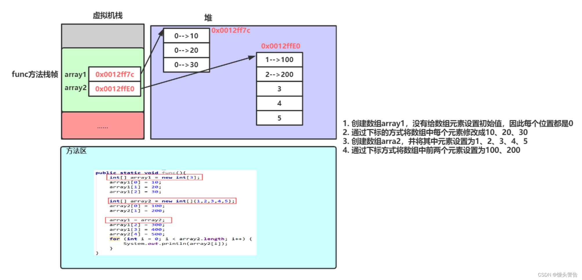 1. 数组是一段连续的内存空间,因此 支持随机访问,即通过下标访问快速访问数组中任意位置的元素2. 下标从 0 开始,介于 [0, N )之间不包含 N , N 为元素个数,不能越界,否则会报出下标越界异常。