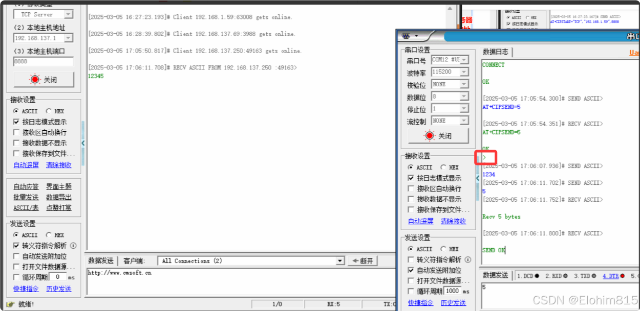 这种方式只能实现单次固定长度数据的发送输入后会出现箭头,表示后续需要往串口发的就是想发送到服务器的5个字节的数据