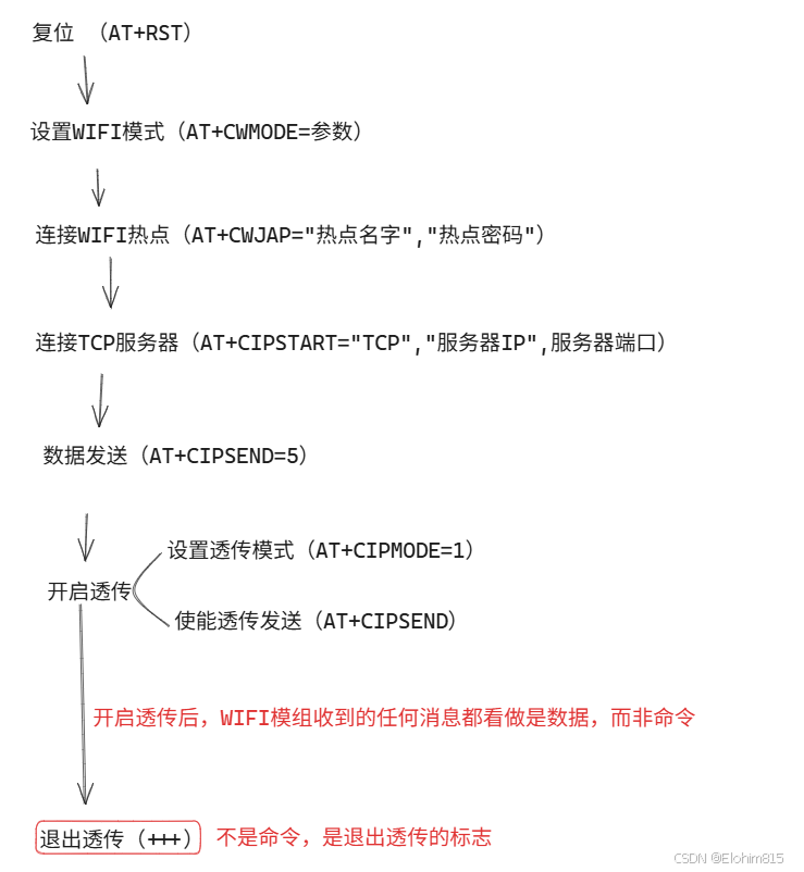 在透传模式中,若识别到单独的一包数据“ +++”,则退出透传模式。
