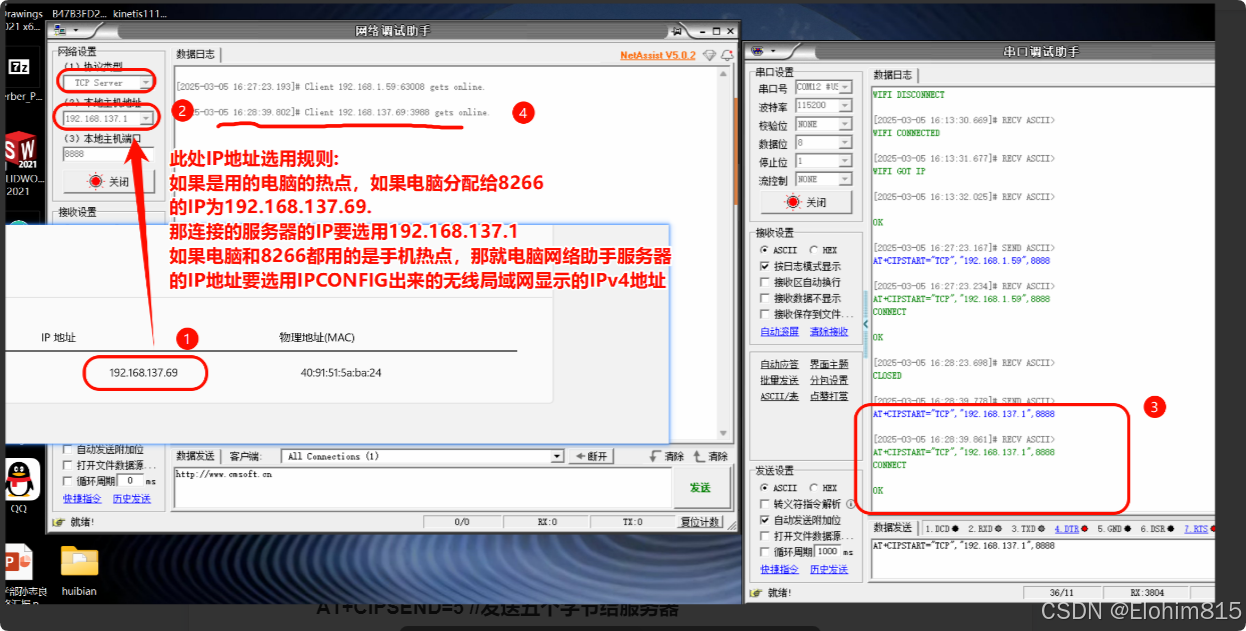 AT+CIPSTART="TCP","服务器IP",服务器端口 此时需要打开一个同网络下的服务器,可以是虚拟机的用代码写的服务器或者在Windows上打开一个服务器模拟器