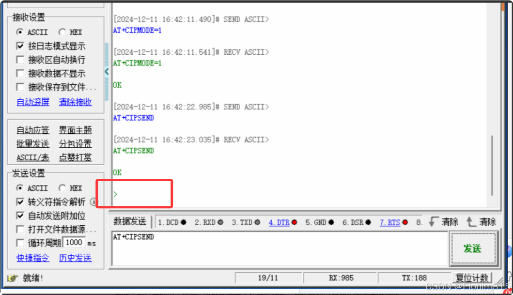 //设置透传模式 AT+CIPMODE=1 //使能透传发送 AT+CIPSEND