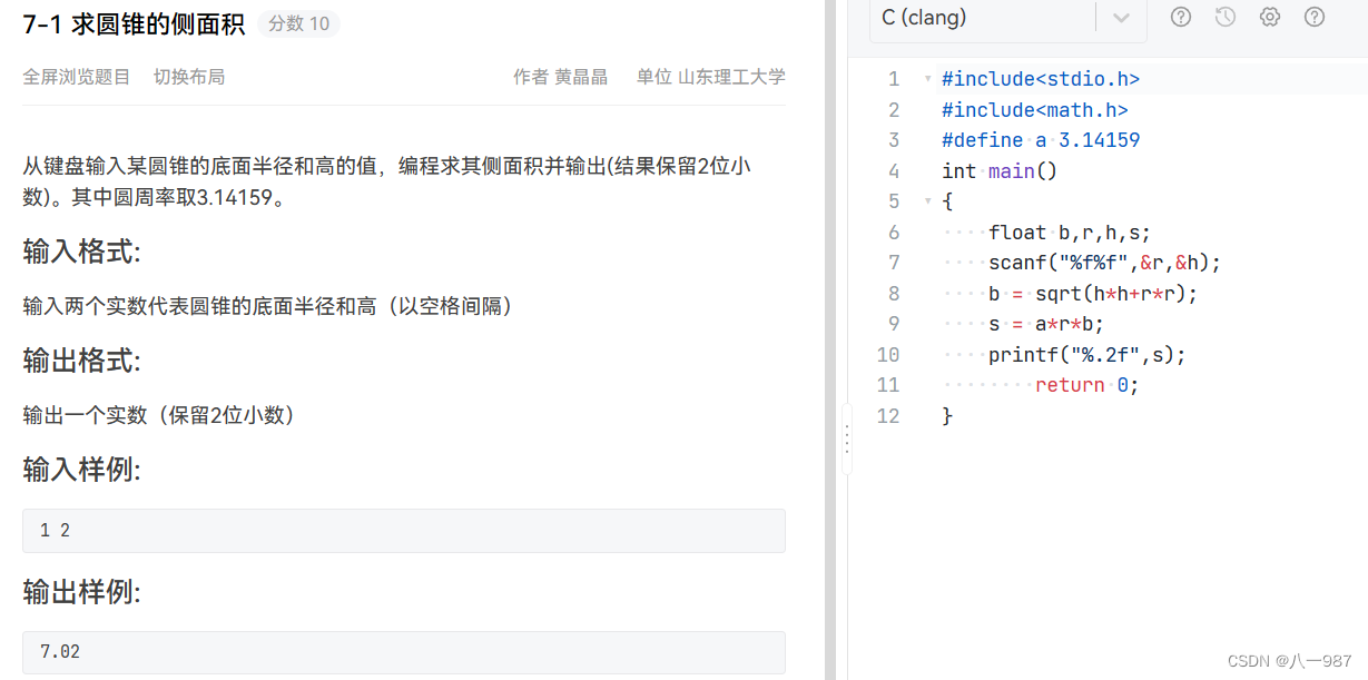 母线通过高和半径的平方和开方得到,代入即可,注意保留实数两位小数,用浮点型float