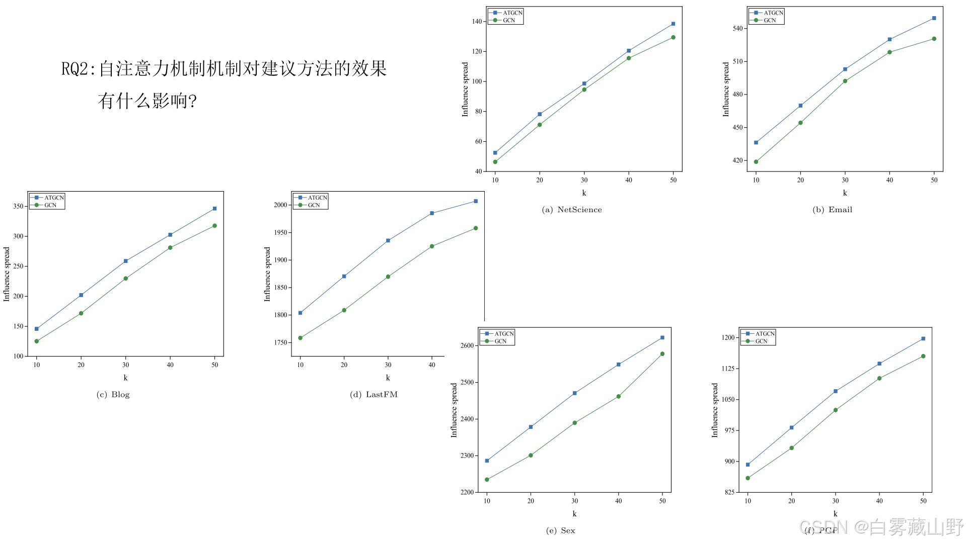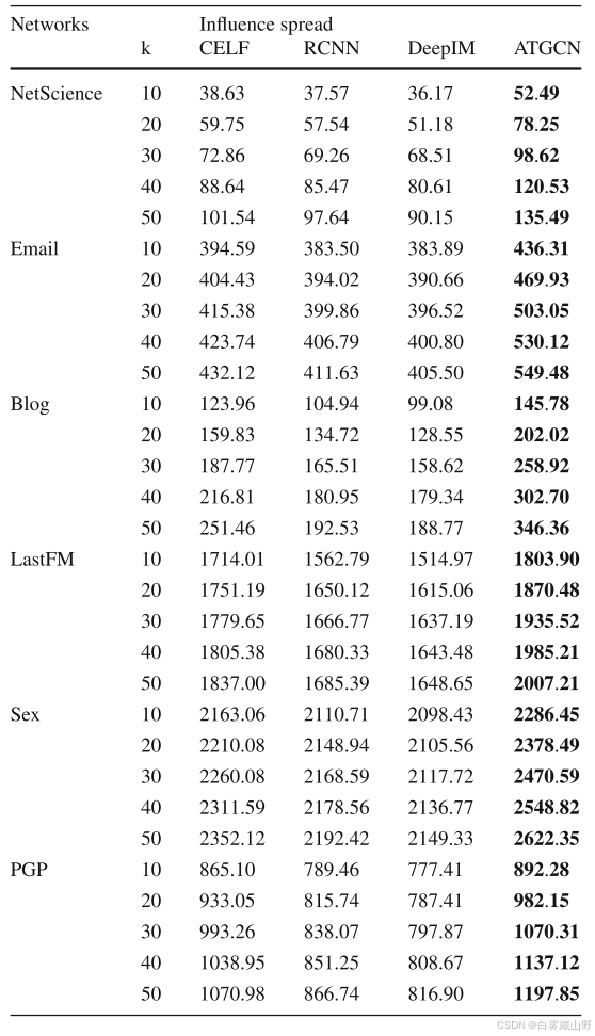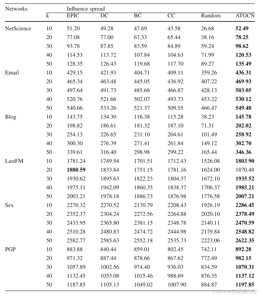 表7显示了建议的ATGCN和五种基线算法在每个网络上的影响范围的总结,k = 10、20、30、40和50。如表7所示,除了在k = 20的LastFM网络上,EPIC[49]返回的场景1880.59之外,基线算法的影响范围都不如ATGCN。我们可以观察到,与现有的最先进的基于贪婪的自适应播种策略相比,所提出的自适应播种策略ATGCN将影响传播率提高了7%。