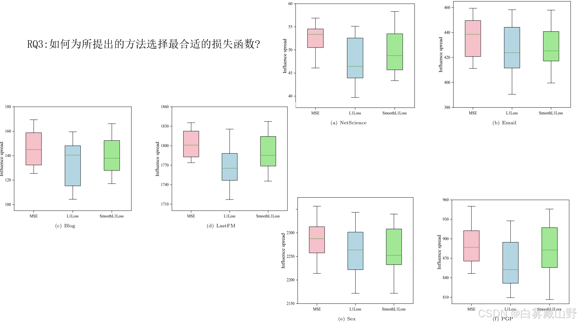 我们在六个现实世界的社交网络上进行了大量的模拟,以比较在预算k = 10的情况下,所提出的atgcn与L1loss (Mean Absolute Error)、MSE和SmoothL1Loss损失函数的性能。在图中,影响扩展绘制在y轴上,L1loss、MSE和SmoothL1Loss绘制在x轴上。实验分别在这三种损失函数上独立运行100次,计算每个损失函数的平均影响范围。从图中我们可以发现,相对于其他两种损失函数,MSE的影响范围是最大的,说明建议模型中的MSE是最合适的损失函数。另一方面,与其他损失函数相比,在我们的回归任务中采用MSE可以有效地提高模型在节点影响预测方面的预测精度。