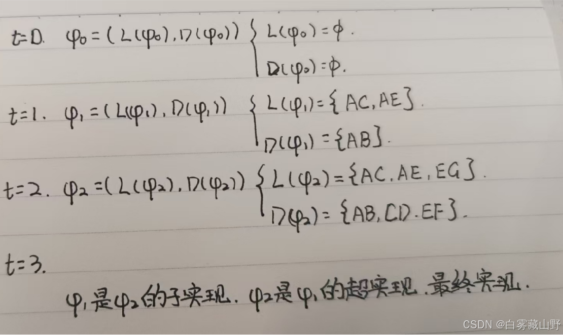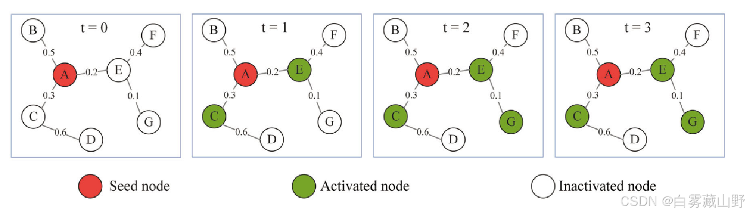以上图为例,在节点尝试激活的过程中,已经被激活的边进入活边集L,激活失败的边进入死边集D,还未尝试激活的边是未知的,而L和D就是一个实现,如果L和D的并已经包含了所有的边,那么此时的实现就是一个完全实现, 否则就是一个部分实现,而传播过程结束时的实现就是最终实现,当一个实现时另一个实现的子集,那他就是另一个实现的子实现,另一个实现时这个实现的超实现。