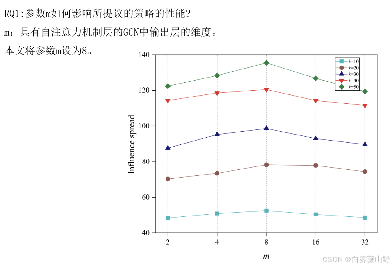 在网络NetScience上进行了实验,以检查m如何影响建议策略的性能。图3显示了不同播种预算下,拟议策略ATGCN在NetScience上实现的影响传播。因此,x轴表示m的值,y轴表示影响范围。预算越大,影响范围越大,如图3所示,因为预算决定了可以选择的种子数量。此外,当m < 8时,可以观察到,随着m的增加,本文方法的性能逐渐提高,而当m大于8时,atgcn的效果逐渐减弱。这是因为较小的m值可能导致信息丢失,这将阻止模型捕获图的关键特征,而较大的m值可能涉及额外的噪声,这将降低模型的泛化能力。因此,本文将参数m设为8。