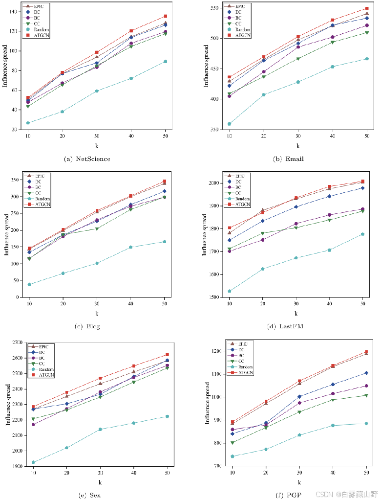 图7显示了控制参数为β = 1的ATGCN、EPIC[49]、DC[6]、BC[43]、CC[43]和Random[6]在6个真实社会网络上5种不同播种预算大小为10、20、30、40和50的实验结果。如图7所示,我们可以直观地肯定,随着播种预算k的增加,影响的传播也随之增加,因为寻求选择更多的种子会导致更广泛的影响传播。从实验结果中可以得出结论,与其他五种基线方法相比,所提出的ATGCN在任何网络下的性能都是最好的,而随机策略的性能一直是最差的。因此,毫无疑问,atgcn的表现是最突出的,证明了我们建议的政策的有效性。值得注意的是,当预算k = 20时,LastFM网络中出现了提议的ATGCN不如EPIC[49]的异常情况,即EPIC[49]选择的种子节点比ATGCN的影响力更大。在基线方法中,由于EPIC[49]是一种基于贪婪的算法,可以获得近似的保证,因此其实现的影响扩展优于其他四种方法。对于启发式中心性策略,由于不同网络中网络的拓扑信息不同,DC[6]、BC[43]和CC[43]在不同网络中的性能不稳定。然而,由于与各种网络相关的扩散实现和结构不同,数据集本身可能会对拟议的ATGCN与其他基线策略之间的差距产生影响,如图图所示。