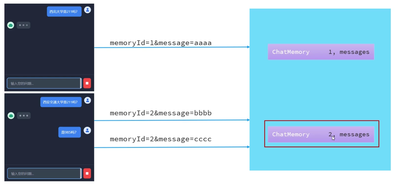 ● 前端:用户输入问题,生成/维护memoryId,发送请求到后端。