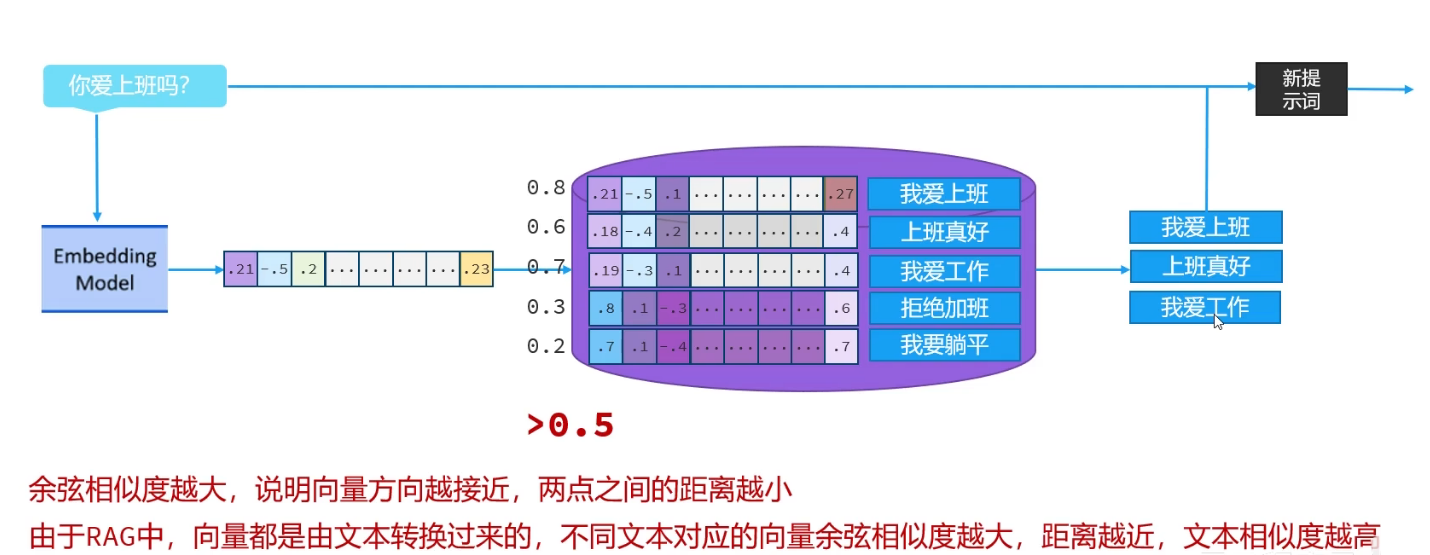 原理:先用Embedding模型将知识库内容向量化,用户提问时将问题向量化后检索最相关的内容,再与大模型结合生成答案。