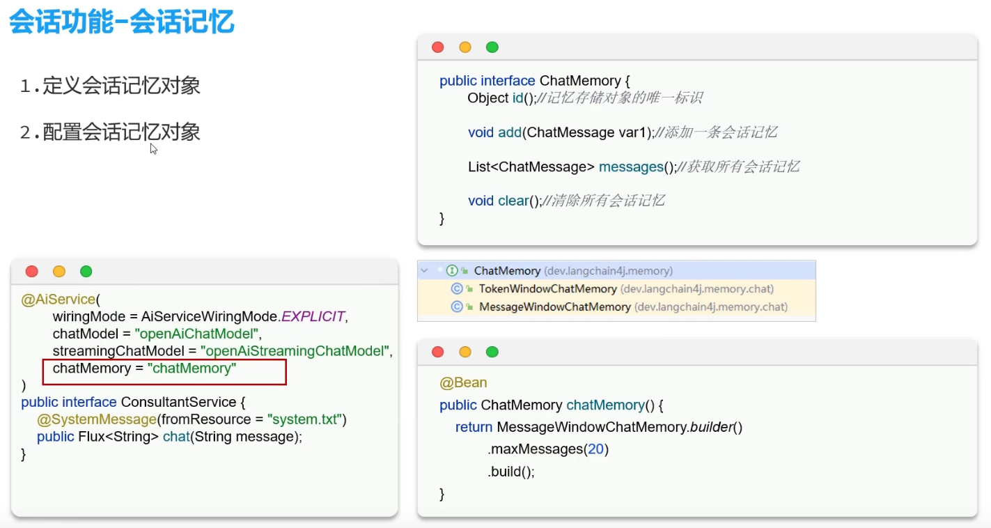 实现:本项目用EmbeddingStore存储向量,ContentRetriever检索相关内容,结合大模型生成更有知识性的回答。 - 会话记忆(Chat Memory)
