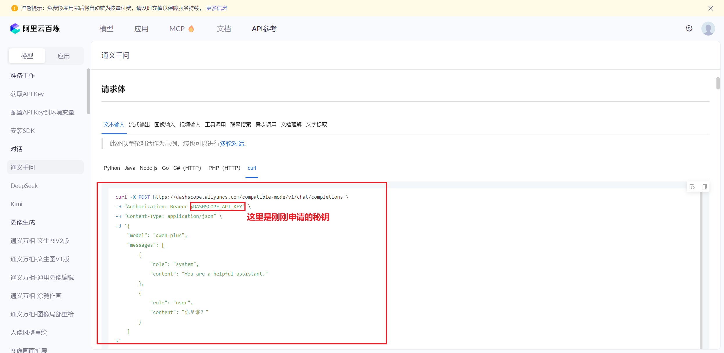 - 打开阿里云百炼平台申请秘钥