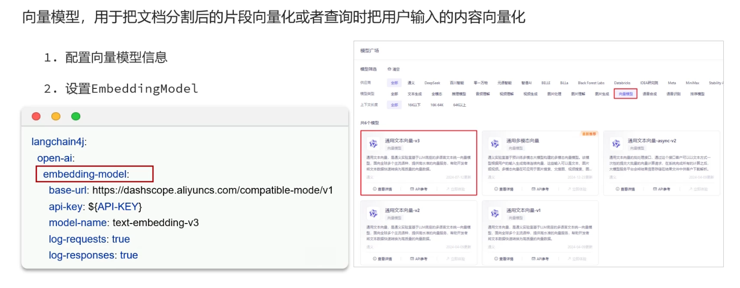 应用:本项目通过LangChain4j集成了OpenAI(如GPT-3/4)或阿里云通义千问(Qwen)等大模型,实现了智能问答、对话等功能。 - 向量化与Embedding