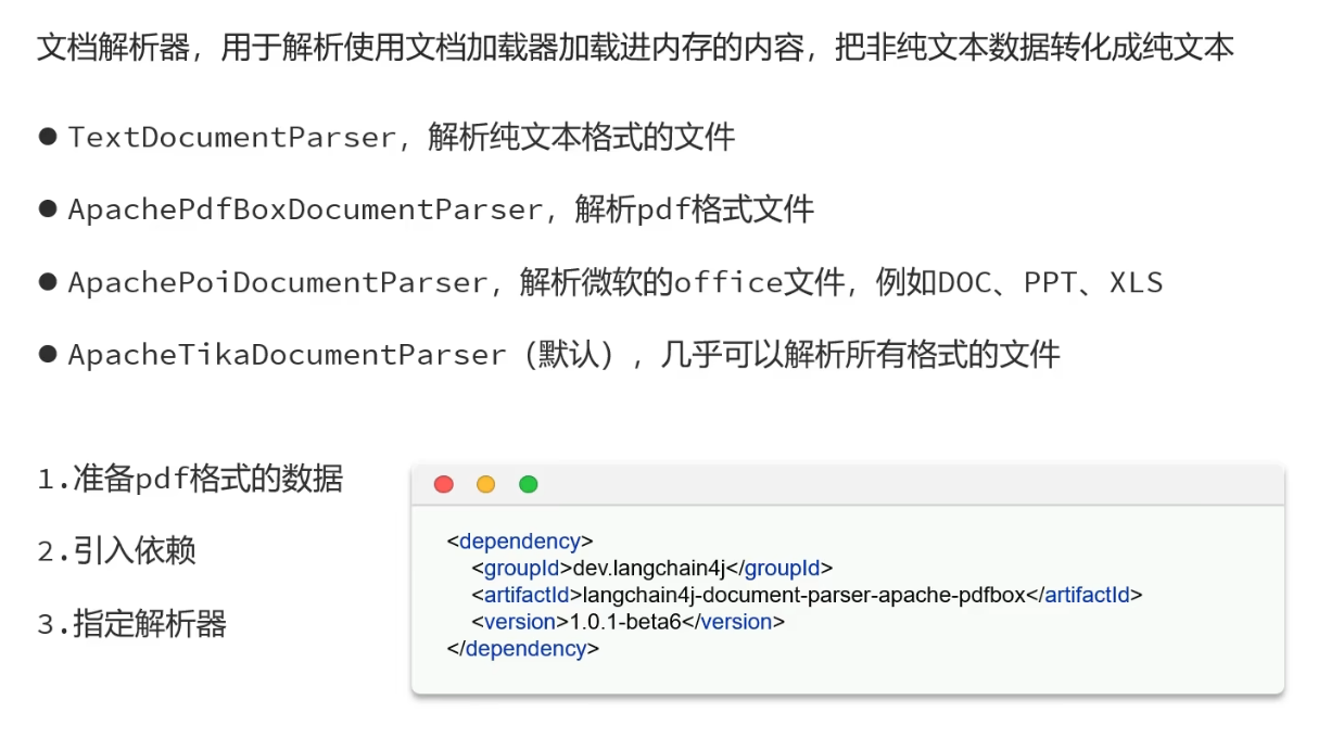 文档加载与解析:支持PDF、TXT等格式,使用Apache PDFBox、Tika等解析器。