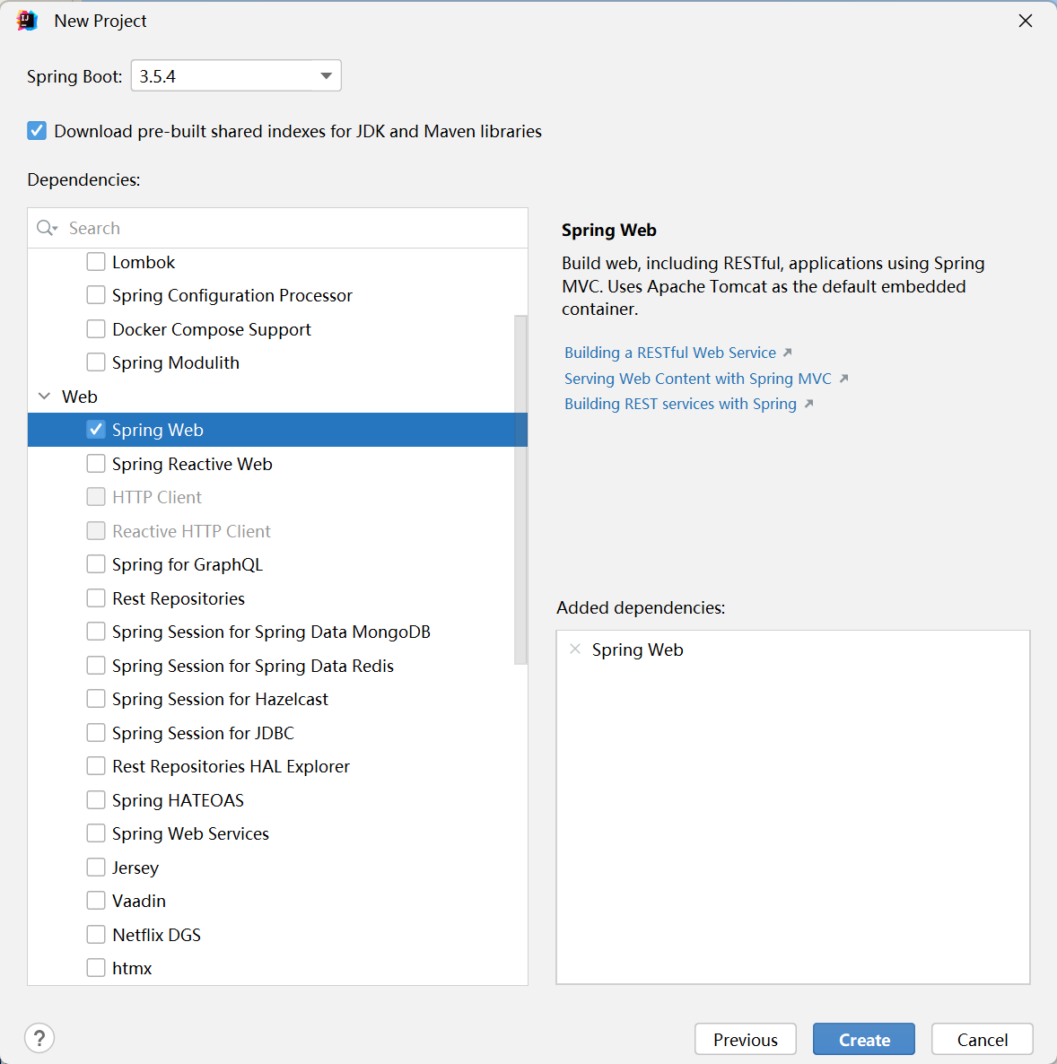 选择Spring Web,因为我们要开发一个web项目访问浏览器