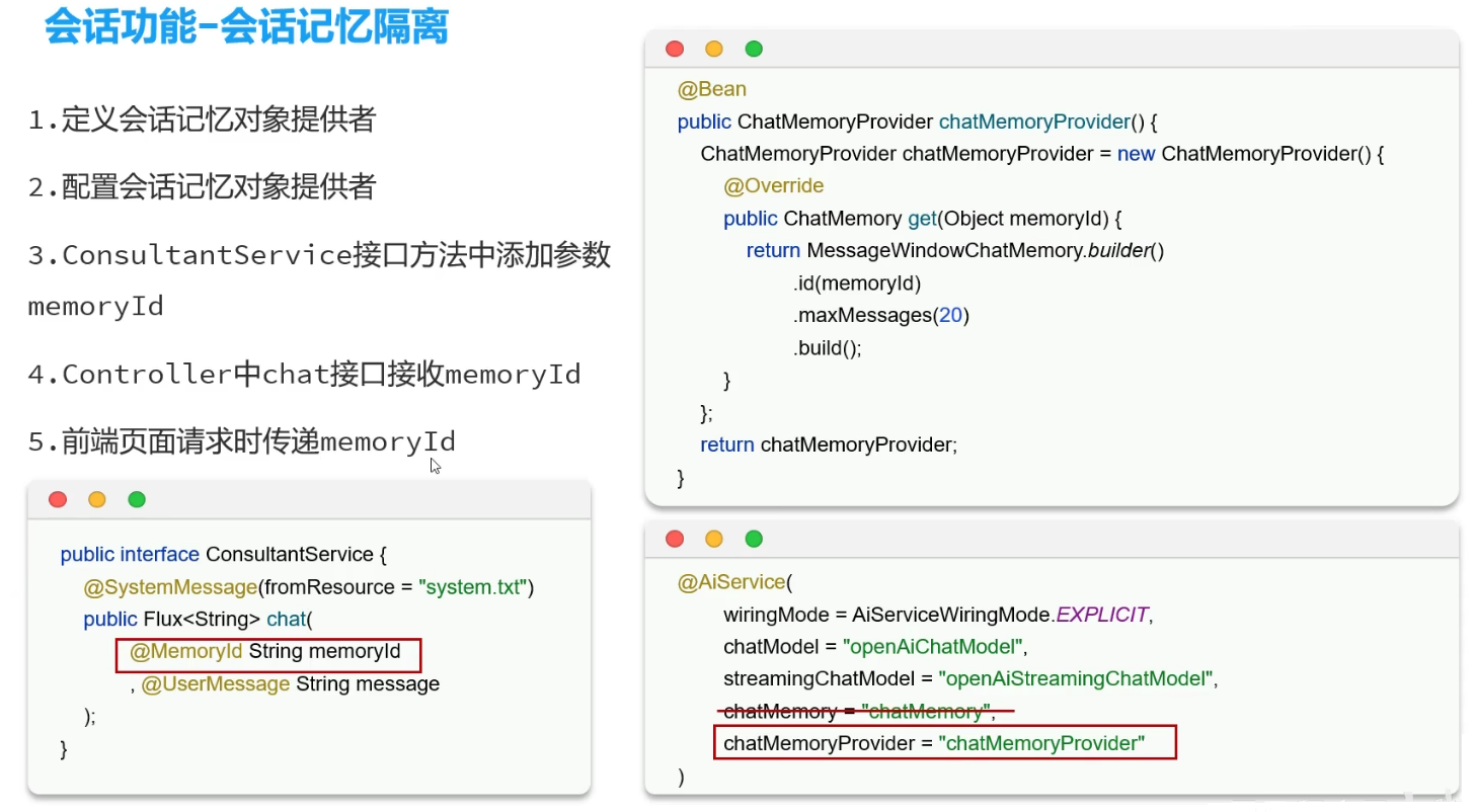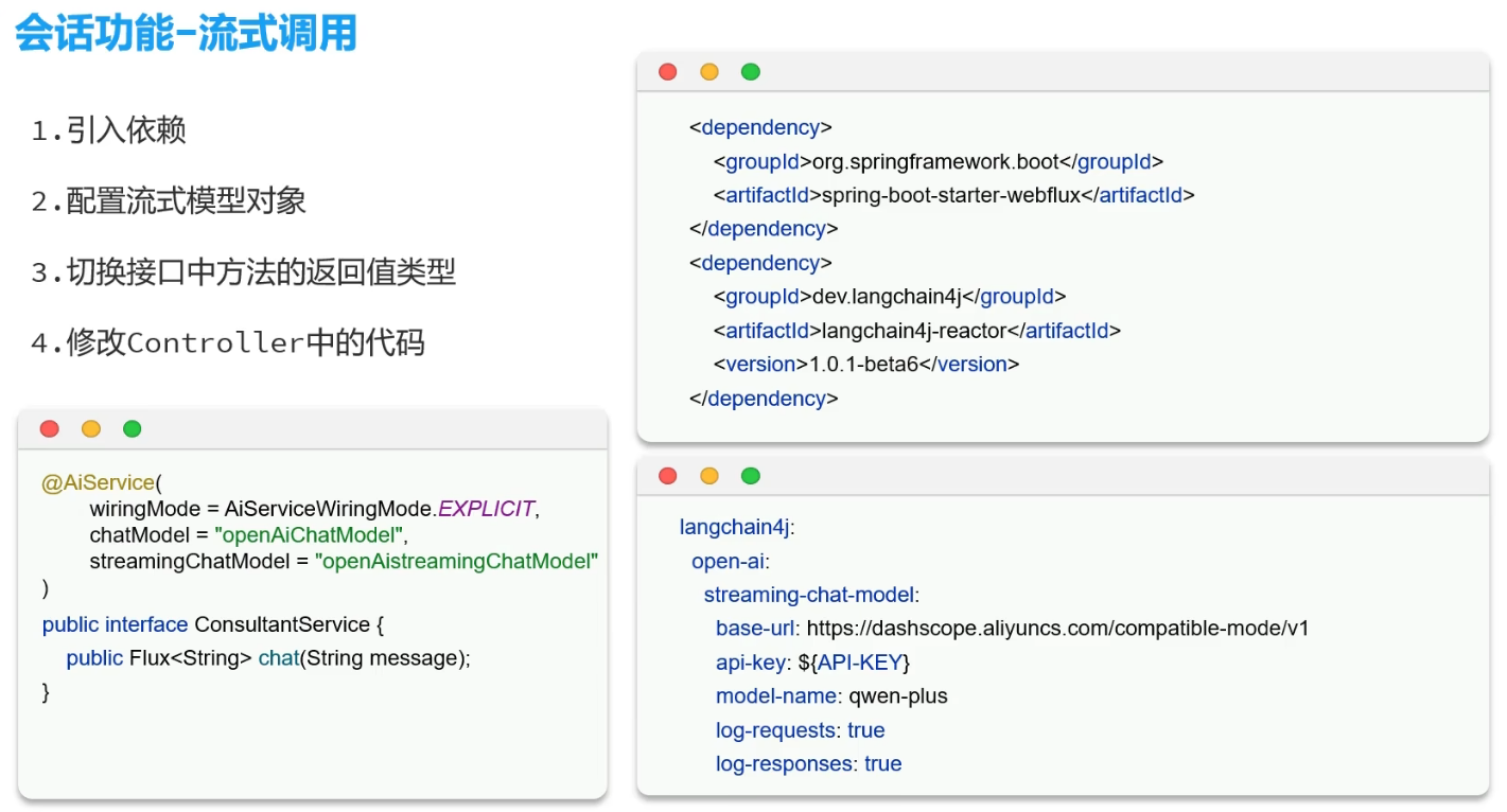 实现:通过ChatMemory和ChatMemoryStore(如Redis持久化)实现,memoryId用于区分不同会话。 - 流式响应(Streaming)