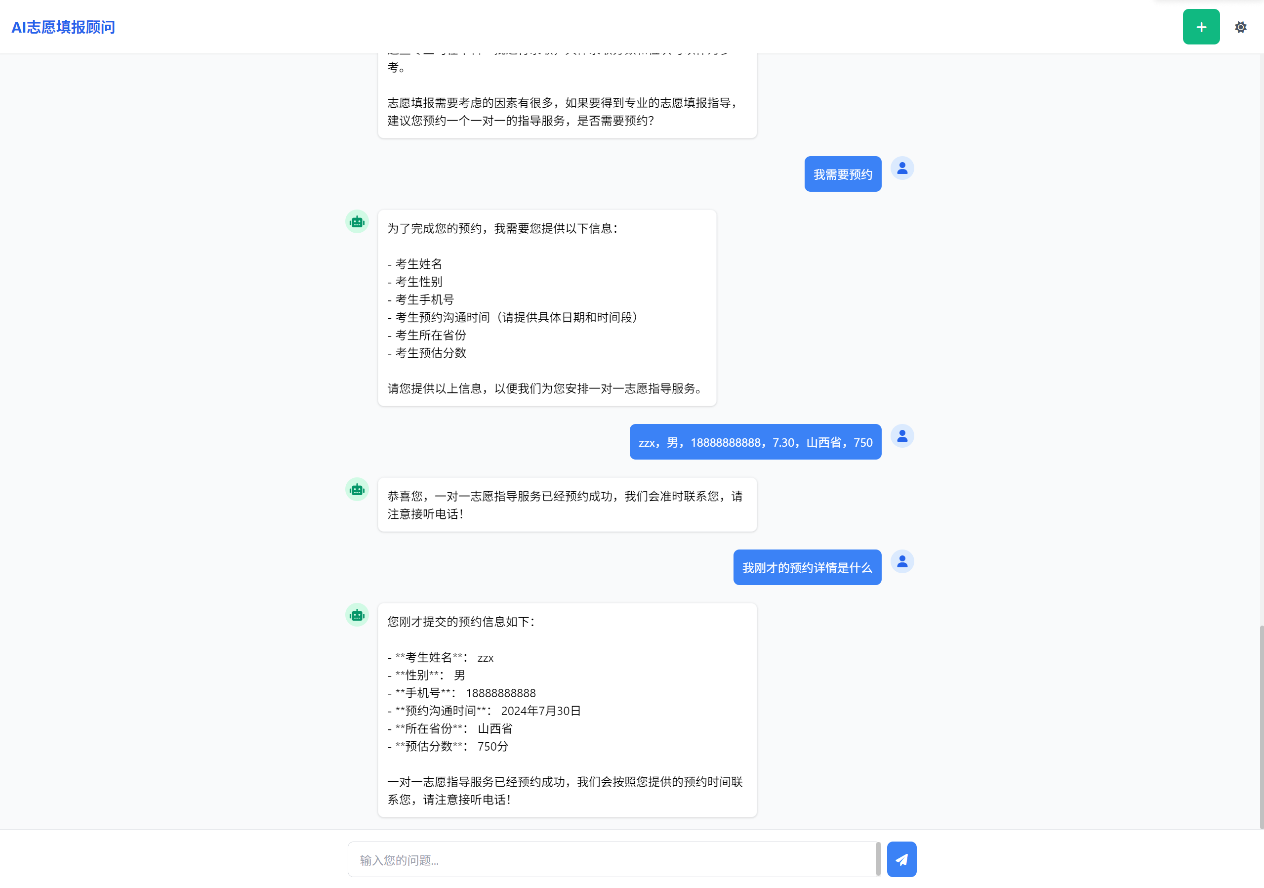 "content" : "为了完成您的预约,我需要您提供以下信息:\n\n- 考生姓名\n- 考生性别\n- 考生手机号\n- 考生预约沟通时间(请提供具体日期和时间段)\n- 考生所在省份\n- 考生预估分数\n\n请您提供以上信息,以便我们为您安排一对一志愿指导服务。"