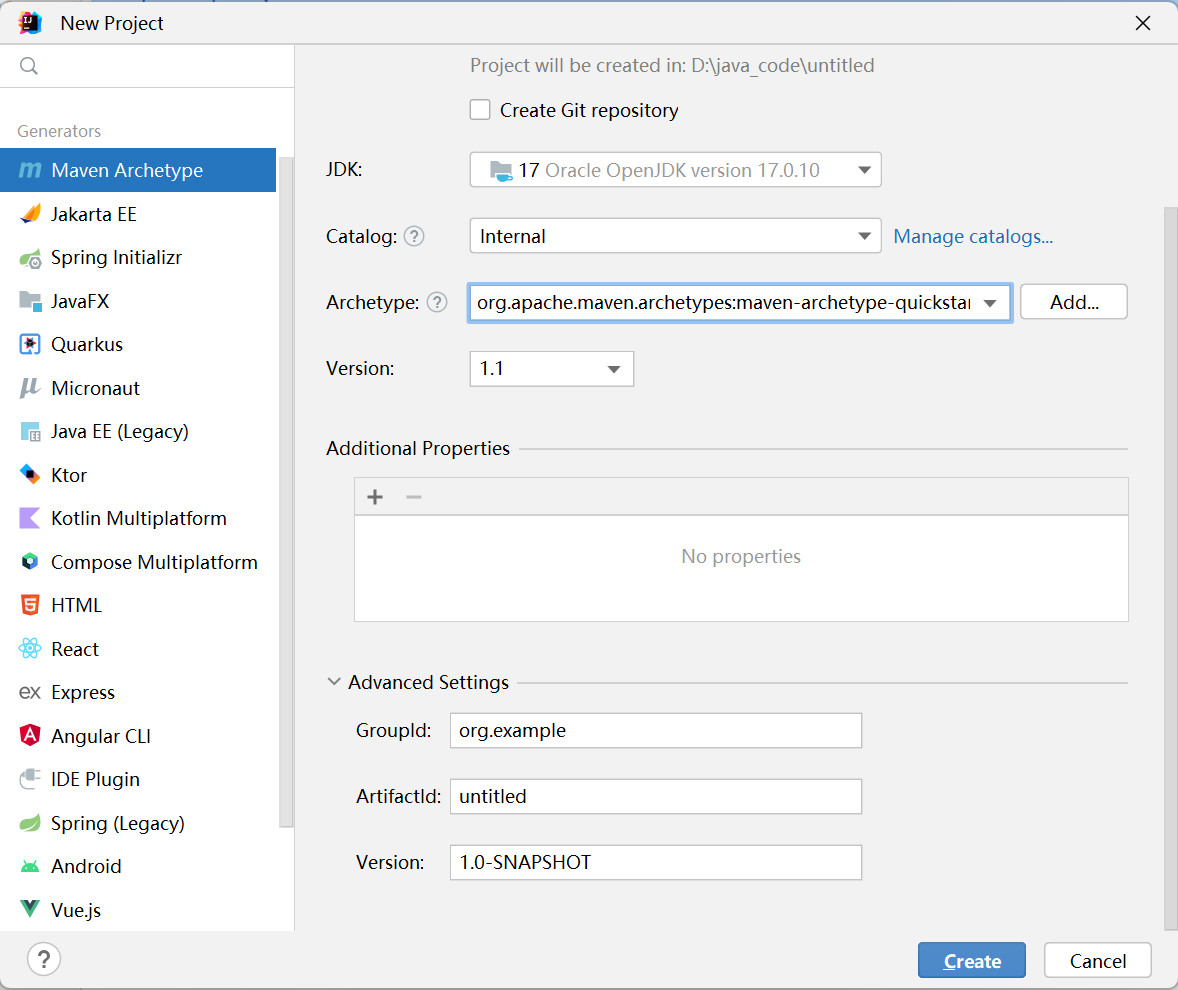 新建project,选择maven项目,选择jdk17,选择quickstart