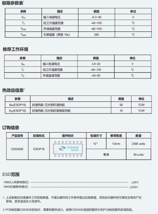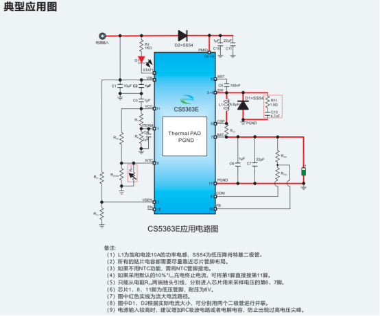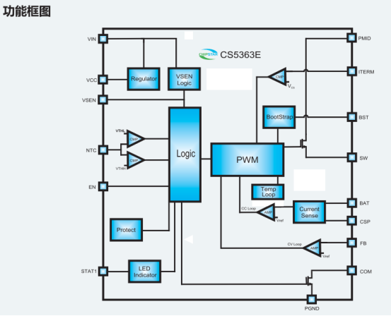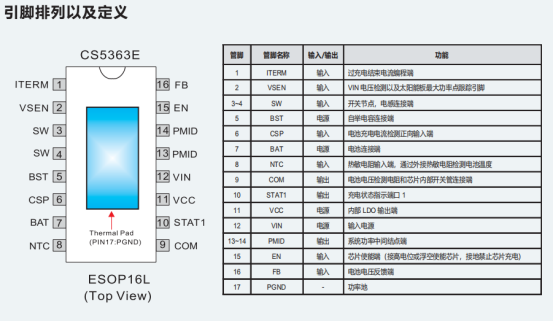 在磷酸铁锂电池包、锂电电池包、笔记本电脑、电动工具、便携式工业与医疗仪器及太阳能板充电设备等场景的供电设计中,常面临输入电压波动大、多节电池适配难、充电效率低及保护需求全面等问题,CS5363E可针对性应对这些需求。该器件是一款异步降压型多节锂电池充电管理IC,采用ESOP16封装,输入耐压30V,工作电压范围3.6~20V,最大充电电流4A且可通过外部电阻按公式灵活调节,集成功率MOS以简化外围电路,降低方案尺寸与成本。