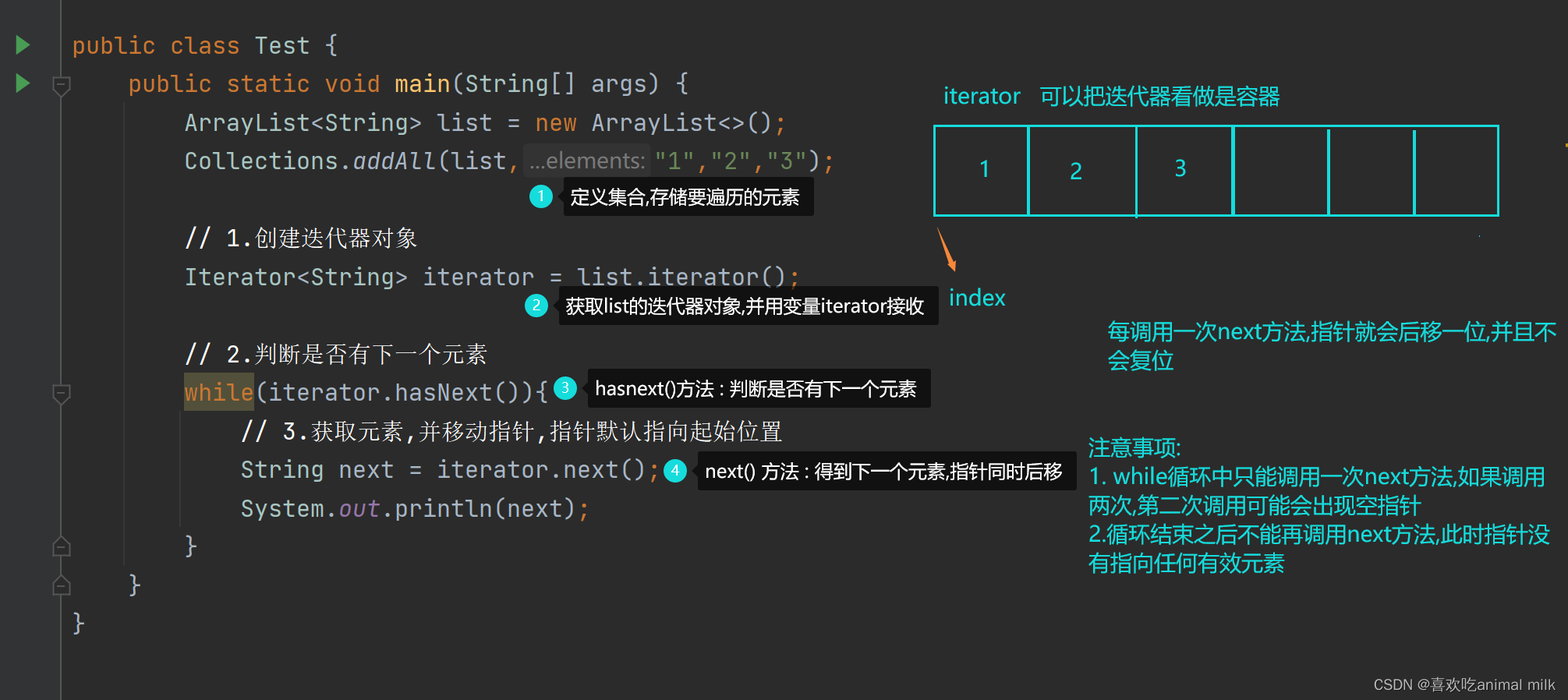 迭代器(Iterator)是一种对象,它可以让我们遍历集合对象中的元素。Java中的集合类(例如ArrayList、LinkedList、HashSet、TreeSet等)都实现了Iterable接口,因此可以使用迭代器来遍历集合中的元素。