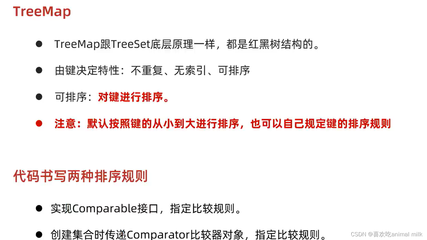 有序性:TreeMap会根据键的自然顺序或者自定义的比较器来维护键值对的顺序。即,遍历TreeMap时,键值对的顺序是有序的。