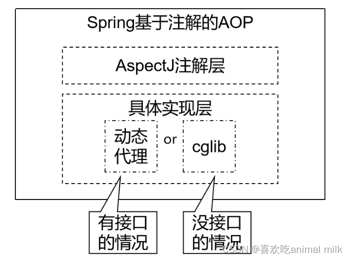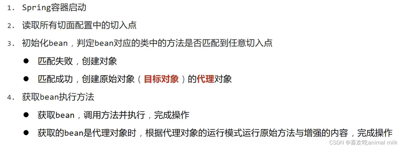 3. Spring AOP框架,基于AOP编程思维,封装动态代理技术,简化动态代理技术实现的框架!SpringAOP内部帮助我们实现动态代理,我们只需写少量的配置,指定生效范围即可,即可完成面向切面思维编程的实现!