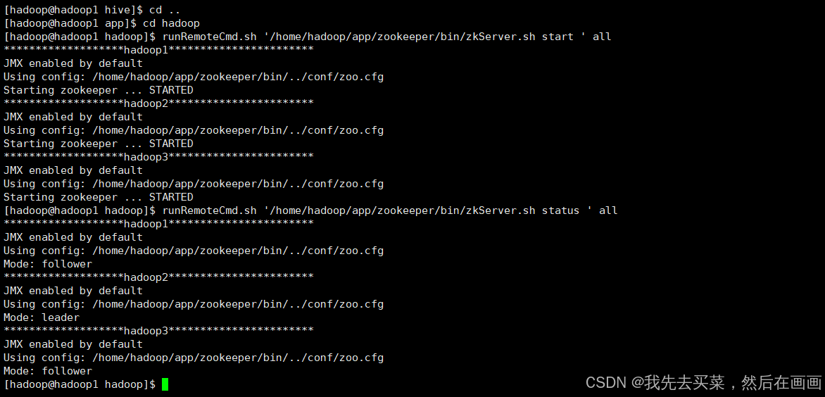 runRemoteCmd.sh '/home/hadoop/app/zookeeper/bin/zkServer.sh start ' all