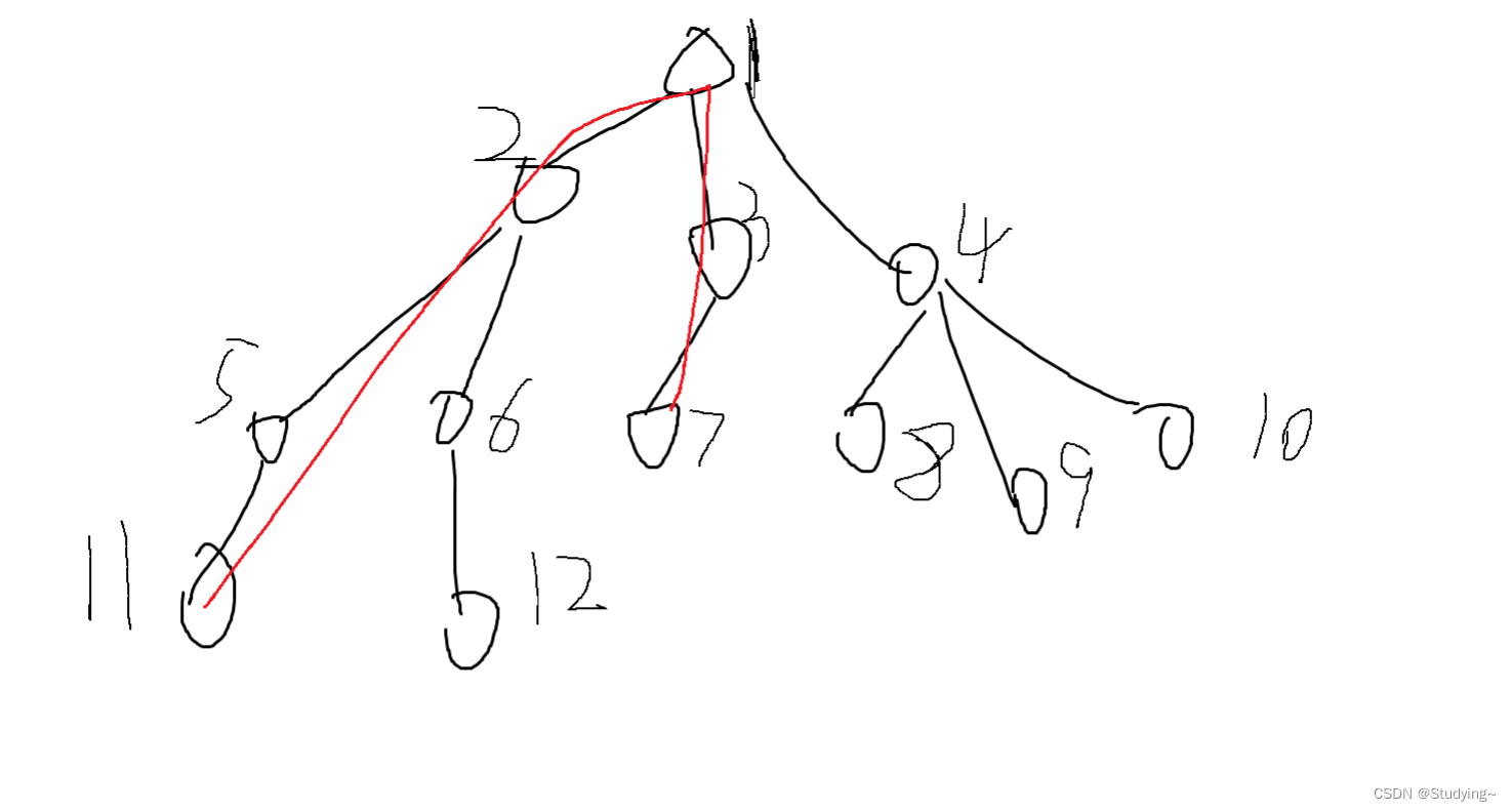 现在假设有一棵这样的树,我们并不关心每条边的路径权值为多少,假设划红线的地方是异或值最大的一条路径,那我们可以发现我们只需要知道1-11的异或值,1-7路径的异或值,那我们在贪心的过程一定能得到最优答案