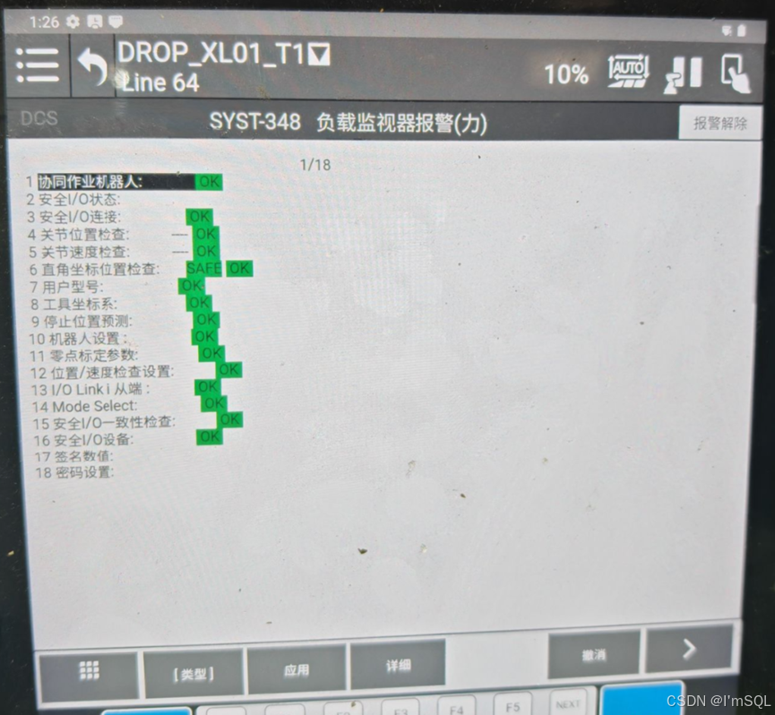 发那科机器人-SYST-348 负载监视器报警(力) 发那科协作机器人报警,SYST-348 负载监视器报警(力),并无法复位报警;输入代码编号(主):1111。点击MENU->系统->类型->DCS。点击,1 协同作业机器人。负载确认成功,报警消除。