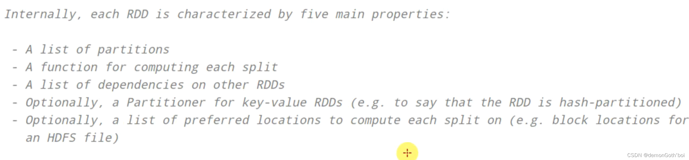 【Spark RDD详解】 RDD(Resilient Distributed Dataset)叫做弹性分布式数据集,是 Spark 中最基本的数据抽象,代表一个不可变、可分区、里面的元素可并行计算的集合。Dataset:一个数据集合,用于存放数据的。Distributed:RDD 中的数据是分布式存储的,可用于分布式计算。Resilient:RDD 中的数据可以存储在内存中或者磁盘中。