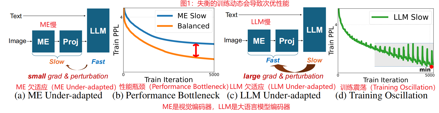 - (a)模态编码器(ME)适配不足:ME 和投影层(Proj)的收敛速度慢(梯度小、扰动弱),而 LLM 主干网络收敛快。