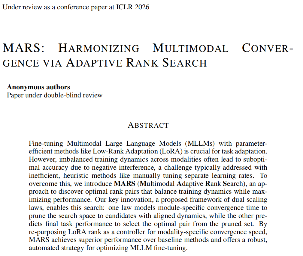 一篇投稿至 ICLR 2026 的会议论文(处于双盲评审阶段),核心聚焦多模态大语言模型(MLLM)微调中的模态收敛协调问题,提出了名为 MARS 的自适应秩搜索方法。