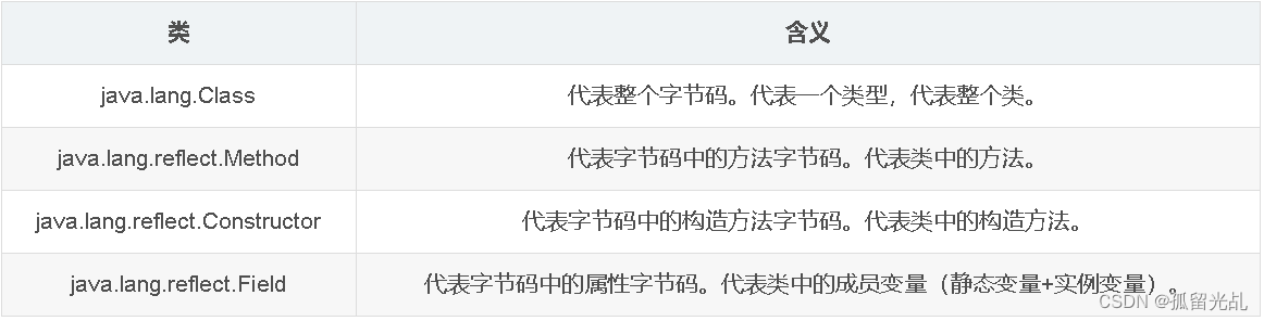 例如:一个类有:成员变量、方法、构造方法、包等等信息,利用反射技术可以对一个类进行解剖,把个个组成部分映射成一个个对象。