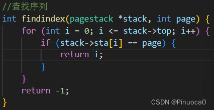当页面在内存中时,还需要将这个页面调到栈顶,要先知道这个页面在数组中的位置,所以还要一个查找函数,查找函数和判断是否在内存中一样,唯一不同的是,如果遍历时找到页面了,查找函数要返回该页面在内存中的位置